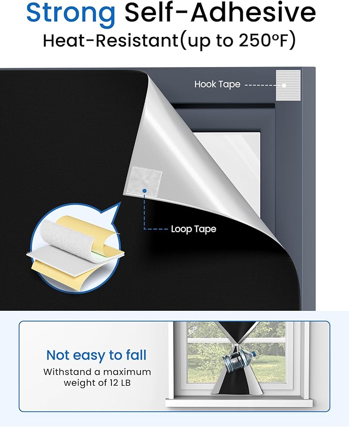 • ✨【Upgrade Heat-Resistance Magic Tapes】Sumobaby 34"x72" blackout curtain for bedroom features premium pre-attached tapes for easy,drill-free installation.Two extra tape strips included,each splitable into 5 squares.Made of acrylic, these tapes leave no residue,providing strong adhesion and heat resistance(200°F to 250°F).Bid farewell to concerns about your black out curtains slipping in hot weather.