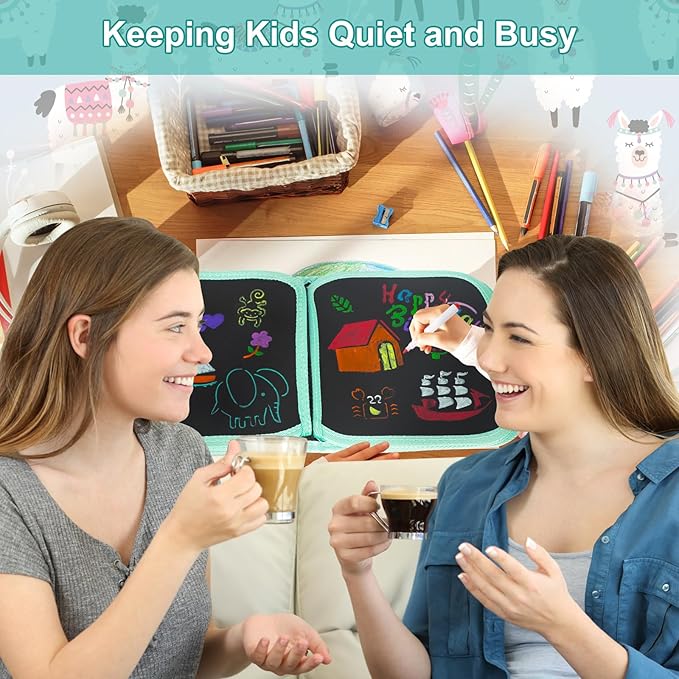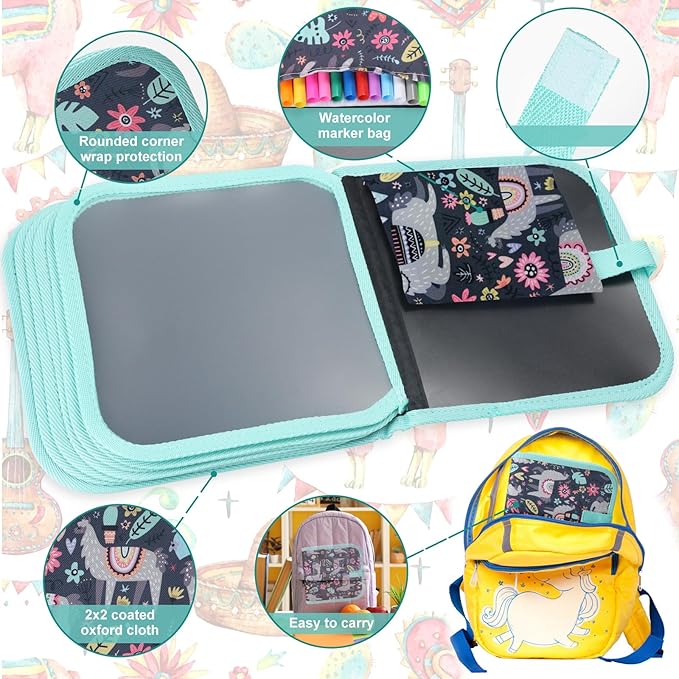 • 🎨Kid's Road Trip Essentials--Kids Erasable Graffiti Book has sticky buttons on the outside to keep it in place and a pens pocket on the inside for 12 watercolor pens. Even in cars, planes and other means of transportation, kids can draw as much as they want.