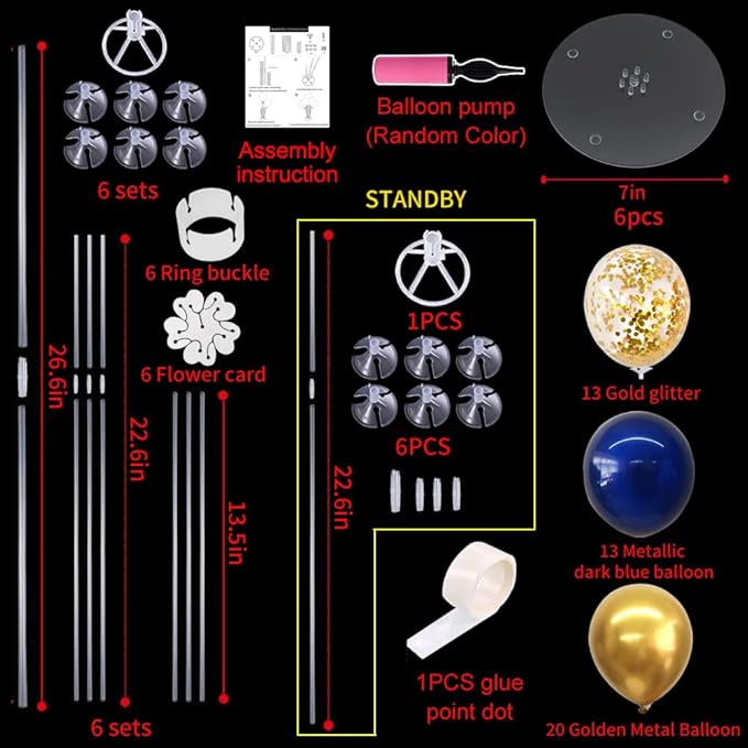 • Package Includes: The balloon stand kit includes 6 reusable balloon centerpiece table decorations and 12 inch 48pcs Latex Balloons(21 gold balloons,15 navy blue balloons,12 gold confetti balloons),glue point dots,balloon pump,balloon clips,and tie tool.You don’t need to waste money to buy balloons