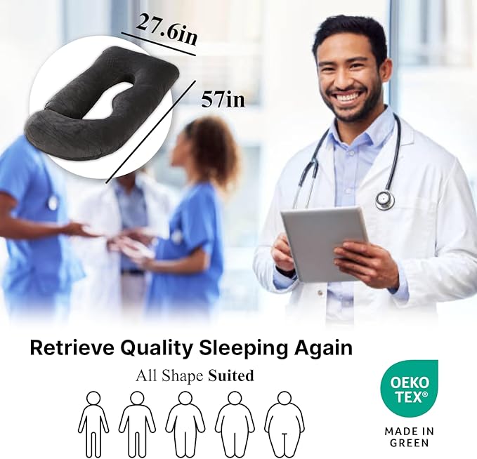 • Shape and Sizes: The ALLOPERA full-body maternity pillow measures 57 inches (145 cm) in length, offering extensive support for the entire body. Its ergonomic design, combining both C shape and U shape, is tailored to provide 360-degree comfort, making it ideal for various sleeping positions, whether side sleeping, back sleeping, or when dealing with a growing belly. The pillow's generous size ensures that users, especially those in later stages of pregnancy, can enjoy relief from multiple body areas, including the back, hips, and legs.