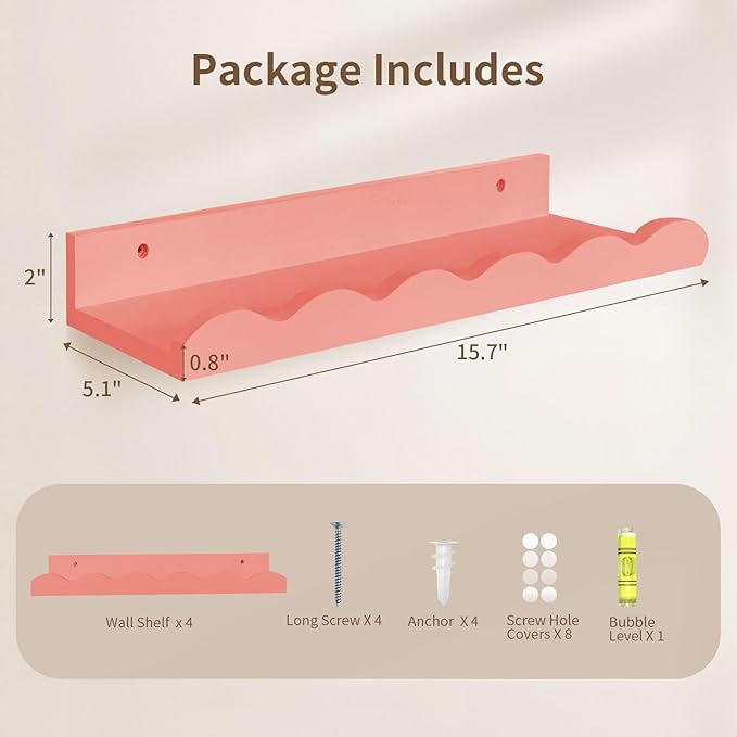 • Easy to Install - The Bookshelf for Nursery Comes with Detailed Installation Instructions to Ensure Easy and Quick Installation. The Package Includes 4 Bookshelves, Self-Adhesive ScrevHole Covers x8, Screws (8mm x 40mm)X8, Heavy Duty Drywall Anchors (14.5mm x32mm)x8, and Leveling toolx1.
