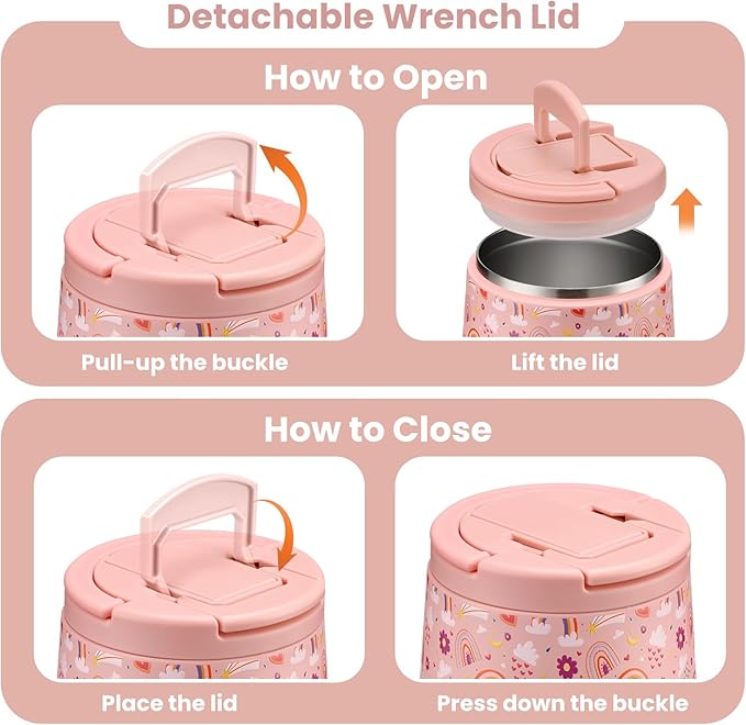 • New Buckle of Lid: The food containers feature a press-seal construction, allowing you to simply pull the handle upwards to 90° to open the lid/ 90° downward closure. This design is maintaining vacuum no need to rotate the lid open . Additionally, the container comes equipped with a carrying handle, making it convenient for your child to carry it. Whether at school, an outdoor outing, or a family gathering, this user-friendly design empowers children to confidently enjoy their delicious meals.