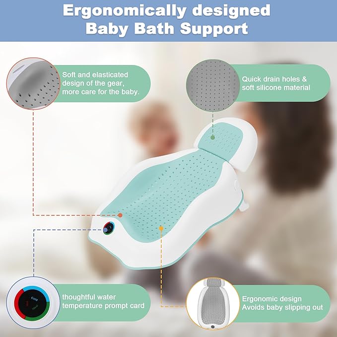 • SIMPLE AND PRACTICAL: Bathing your baby is hassle-free, holding your baby in your arms frees up your hands for washing and playing. With thoughtful water temperature reminder card, you can always show the water temperature change, keep your little one's bath water at the optimal temperature.