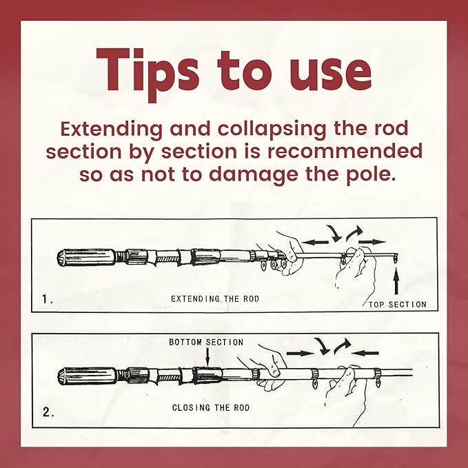 • Convenient Portability: Our collapsible fishing rod makes it easy to transport and store, and you can pack all your fishing accessories into one fishing bag, and you can take them wherever you want, and the fishing bag also provides added protection while on the go. Tips: Extending and collapsing the rod section by section is recommended so as not to damage the pole