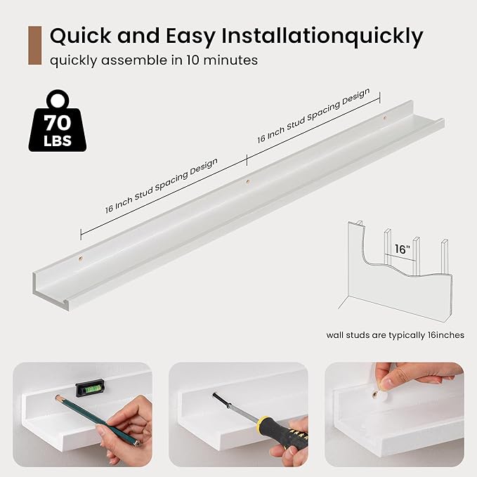 • 3.5" Floating Picture Ledge: Anti-Slip Narrow Design-3.5" ultra-narrow depth holds frames/plants without sliding, even on angled walls. Stud-Mounted Stability-16" pre-drilled holes match standard studs (hardware incl.) for wobble-free install. Clutter-Free Aesthetic-Clean lines blend with farmhouse/Scandinavian decor, focusing on your treasures