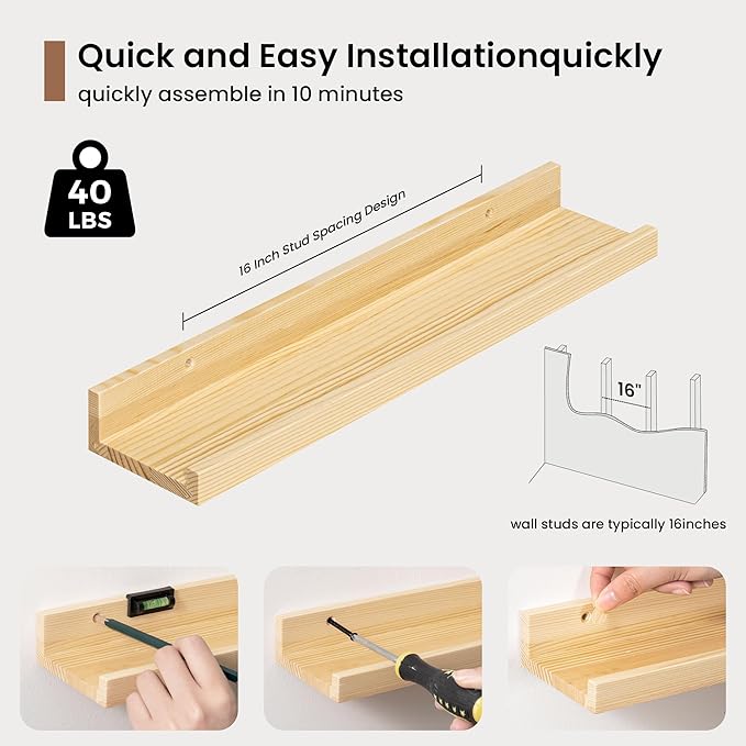 • Easy to Install: Fun Memories fully assembled solid pine wood picture ledge shelf set of 2 comes with the pre-drilled holes and necessary hardware including a mini level to make installation a breeze. The floating design creates a seamless, streamlined look, adding a touch of modern sophistication to your interior. If you have any questions about our products, please feel free to contact us