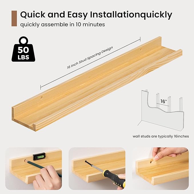 • Multi-Functional Picture Ledge: Get creative and find more functions other than the long picture ledge shelf. Fun Memories solid pine wood storage ledge shelves can act as a kids' bookshelf, display shelf for collectibles figures, spice racks in the kitchen, and more