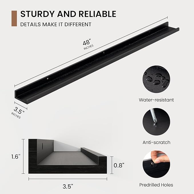 • 3.5" Floating Picture Ledge: Anti-Slip Narrow Design-3.5" ultra-narrow depth holds frames/plants without sliding, even on angled walls. Stud-Mounted Stability-16" pre-drilled holes match standard studs (hardware incl.) for wobble-free install. Clutter-Free Aesthetic-Clean lines blend with farmhouse/Scandinavian decor, focusing on your treasures