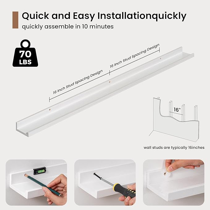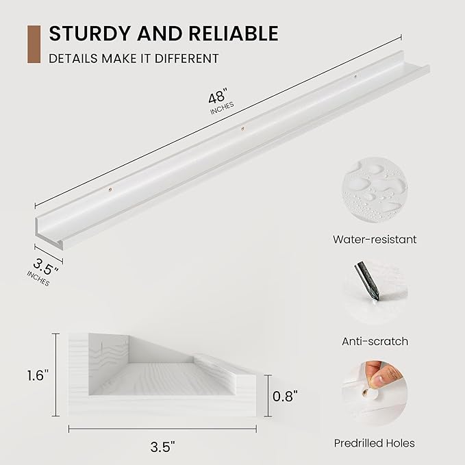 • 3.5" Floating Picture Ledge: Anti-Slip Narrow Design-3.5" ultra-narrow depth holds frames/plants without sliding, even on angled walls. Stud-Mounted Stability-16" pre-drilled holes match standard studs (hardware incl.) for wobble-free install. Clutter-Free Aesthetic-Clean lines blend with farmhouse/Scandinavian decor, focusing on your treasures