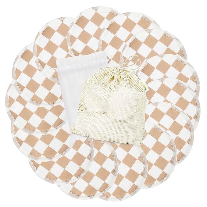 wegreeco Nursing Breast Pads (14 Pack) + Laundry Bag & Travel Storage Bag, 4.7 inch Option - Washable & Reusable Breastfeeding Nursing Pads (Light Coffee Checkerboard, Large, Plain Shape)