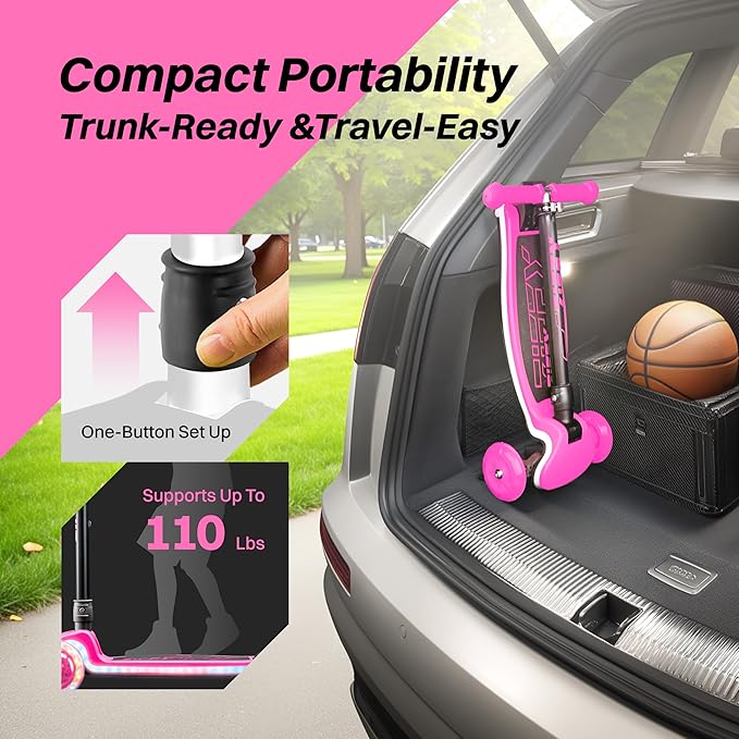 • Compact & Portable – No Assembly Required: Thoughtfully designed to grow with your child, this scooter requires no installation and features a 4-level adjustable handlebar (25.5 / 29.1 / 31.1 / 32.6 inches), ensuring a comfortable fit for years to come. The one-step folding system and lightweight design make it easy to carry and store—perfect for trips to the park, school, or family vacations.