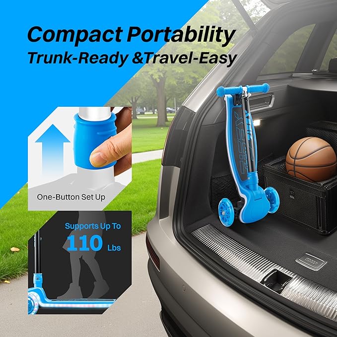 • Compact & Portable – No Assembly Required: Thoughtfully designed to grow with your child, this scooter requires no installation and features a 4-level adjustable handlebar (25.5 / 29.1 / 31.1 / 32.6 inches), ensuring a comfortable fit for years to come. The one-step folding system and lightweight design make it easy to carry and store—perfect for trips to the park, school, or family vacations.