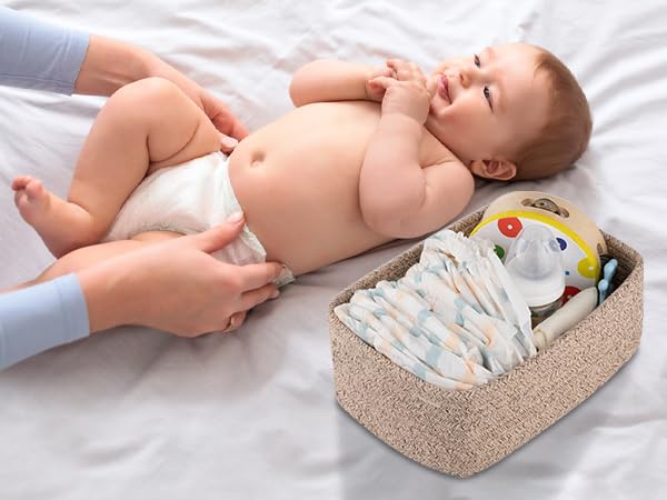 • [Premium Cotton Material]:Our cute baby storage baskets are made of high quality cotton hand-woven by workers, soft and odorless, no sharp edges and corners, very friendly to babies and pets, a good choice for baby-sitting baskets and dog or cat toy baskets