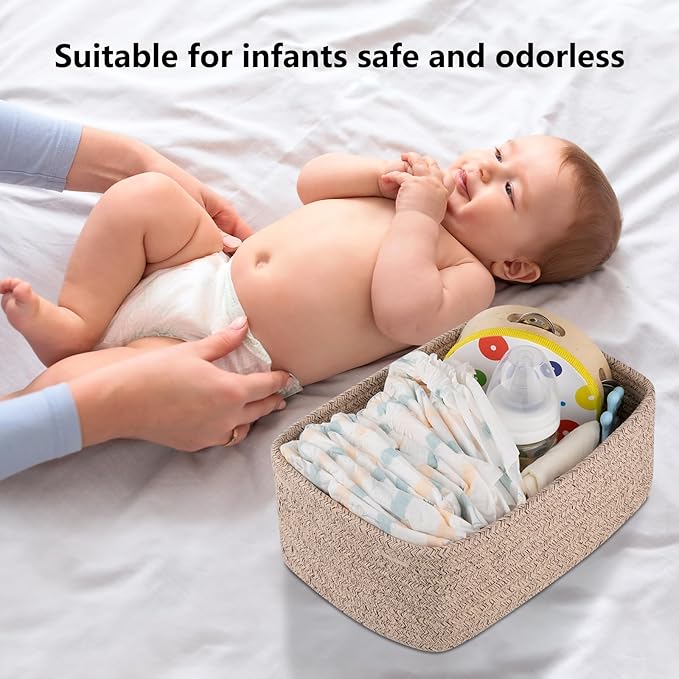 • [Premium Cotton Material]:Our cute baby storage baskets are made of high quality cotton hand-woven by workers, soft and odorless, no sharp edges and corners, very friendly to babies and pets, a good choice for baby-sitting baskets and dog or cat toy baskets