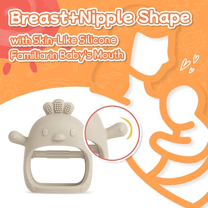 • Easy Toy for Teething Baby - The silicone teething mitten is the perfect solution for babies who aren't yet able to hold onto teethers. The soft hand teether fits over little hands, and the inner bar provides extra grip support for babies to grasp. Plus, the mitten protects babies from chewing on their hand or anything else they could get their teeth on. The soft silicone baby teether is skin-soft to mimic breast feeding, helping further soothe fussy little ones.