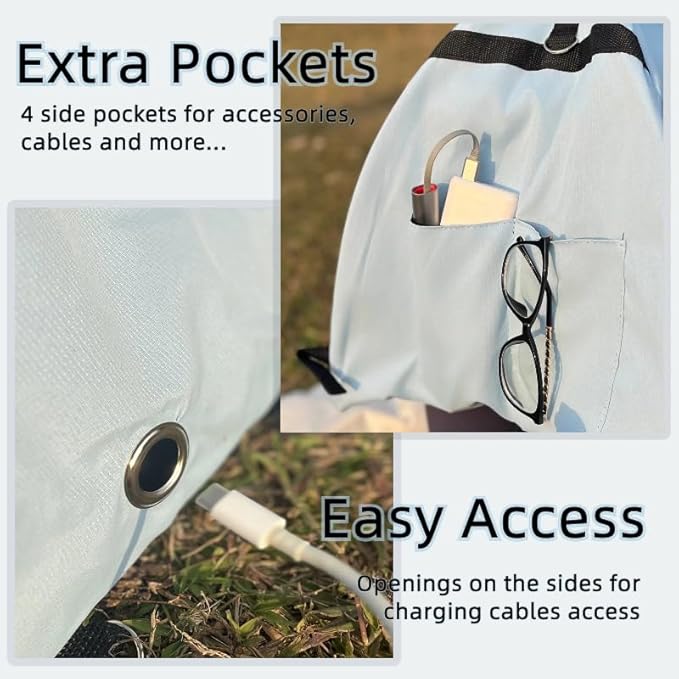 • Practical Design: The tent features side pockets for storing personal items such as your phone, e-reader, and headphones. Additionally, it has a designated opening at the back that allows charging cables to pass through, ensuring your devices stay powered while you work