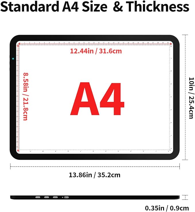 • 【Good for Your Eyes】The Tracking light box maximum brightness up to 9000LUX,Meet your various uses.Our light source is both soft and uniform, effectively safeguarding your eyes from potential harm. This A4 light table is entirely free of luminous spots or strobing effects. Thanks to our advanced eyesight - protecting technology, you can use the tracing light for extended periods without any adverse impact on your eyes.
