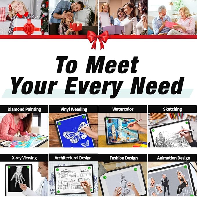 • 【 Multi-Usage 】This Cordless Light Board overall size is 13.86″ x 10″ x 0.35″ ( 35.2 x 25.4 x 0.9 cm) and the visual working area is 12.44″ x 8.5″ (31.6 x 21.8 cm)The LED Light Table is perfect idea for Diamond Painting, stenciling, 2D animation, calligraphy, embrossing, scrapbooking, tattoo tracking, sketching & drawing, streaming, sewing projects, embroidery craft projects, fabric design, photograph, film, slider transferring, architecture, drawing etc.