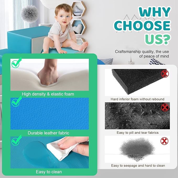 • Fun and Educational: Our climbing blocks with tunnel offer los of fun and educational benefits. The vibrant green and blue color and engaging design of the foam blocks for climbing attract toddlers, while the diverse play elements help vibrate skills
