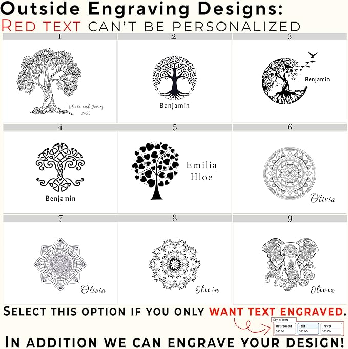 • Personalized: Tree of Life wooden box can be engraved with designs we offer adding the couple's names, a single name, or a short phrase to make it unique. The font will match what’s shown in the photos unless you specify other preferences. Additionally, it can be engraved inside, on the reverse side of the lid. Different font options are available for the inside engraving.
