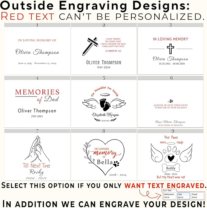 • Customized: create your own memory box by choosing one of the designs we offer and adding a name and date. We’ll use the font style showcased in the photos. The inside lid can also be engraved with your text in the different fonts we offer