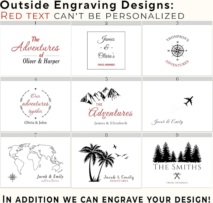 • Customized: this travel memory box can be engraved with designs we offer adding the couple's names, or a single name to make it unique. We’ll use the font style showcased in the photos. Additionally, it can be engraved inside, on the other lid's side, to create a surprise message for the recipient. Different font options for inside engraving