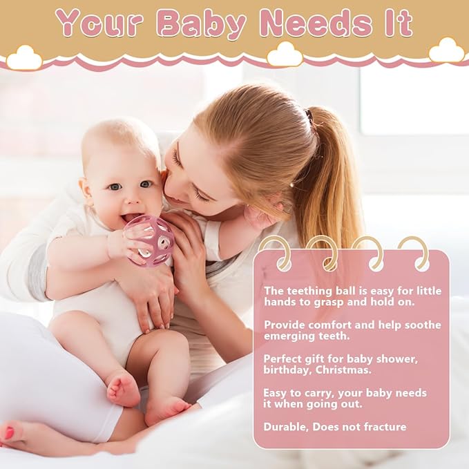 • 【Teething Relief】The soft teething toy eases the discomfort of teething and helps your baby get through the painful teething time. Lightweight and compact, the baby teether ball is easy to fit into a diaper bag.