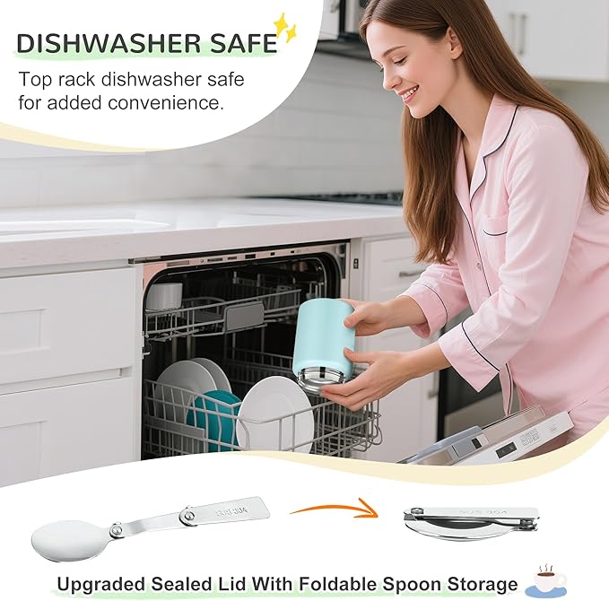• EASY-FILL WIDE MOUTH & CLEVER ACCESSORIES - kids lunch box features a 2.75-inch opening for easy scooping, serving, and dishwasher top cleaning. Hidden grip handle on the lid for safe carrying. Stainless steel folding spoon for easy storage. Non-slip base to prevent slipping.