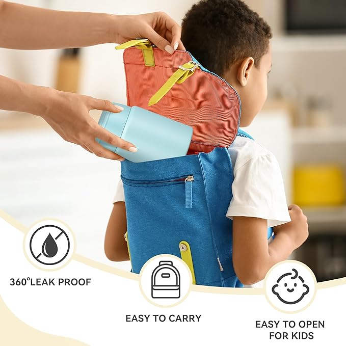 • FOOD-GRADE SAFETY & CPC CERTIFIED - The inside of kids thermo food container is made of high quality 316 stainless steel. Fully compliant with CPC standards to ensure child safe material. Double-layer vacuum insulation design, open lid venting for safe steam release. Durable, care for children's health.