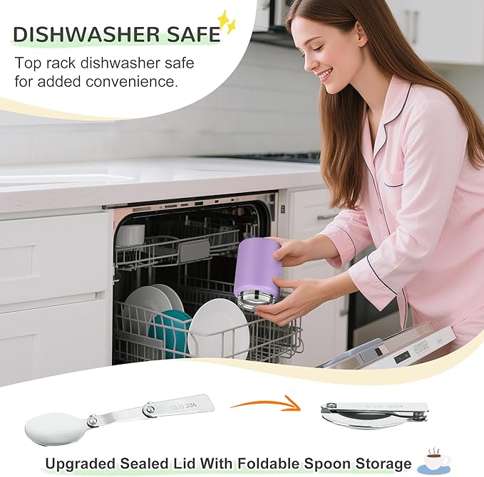 • EASY-FILL WIDE MOUTH & CLEVER ACCESSORIES - kids lunch box features a 2.75-inch opening for easy scooping, serving, and dishwasher top cleaning. Hidden grip handle on the lid for safe carrying. Stainless steel folding spoon for easy storage. Non-slip base to prevent slipping.