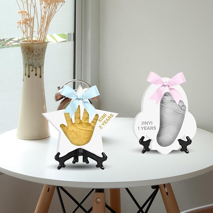 • Set Includes:Two pieces of air dried clay, roller, straw, 2 paint brushes, 2 ribbons, additional custom template kit, 2 display stands, 2 colors of paint.Grey and gold.Everything you need to make beautiful, lasting footprints or paw prints souvenir ornaments to display on your mantel or hang on your Christmas tree.