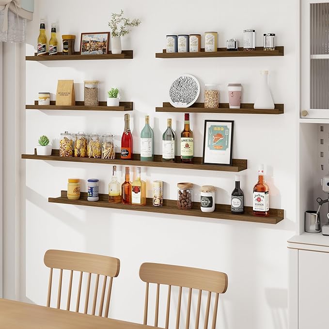 • Picture Wall Collage Decor: Do you have a lot of memorable photos, but don't know how to display them, our wood floating shelves are perfect for you! We offer 6 shelves, you can mix and match colors, height, length, and symmetry. With our long wall shelf set, your dull space will be transformed into wall art