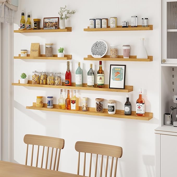 • Picture Wall Collage Decor: Do you have a lot of memorable photos, but don't know how to display them, our wood floating shelves are perfect for you! We offer 6 shelves, you can mix and match colors, height, length, and symmetry. With our long wall shelf set, your dull space will be transformed into wall art