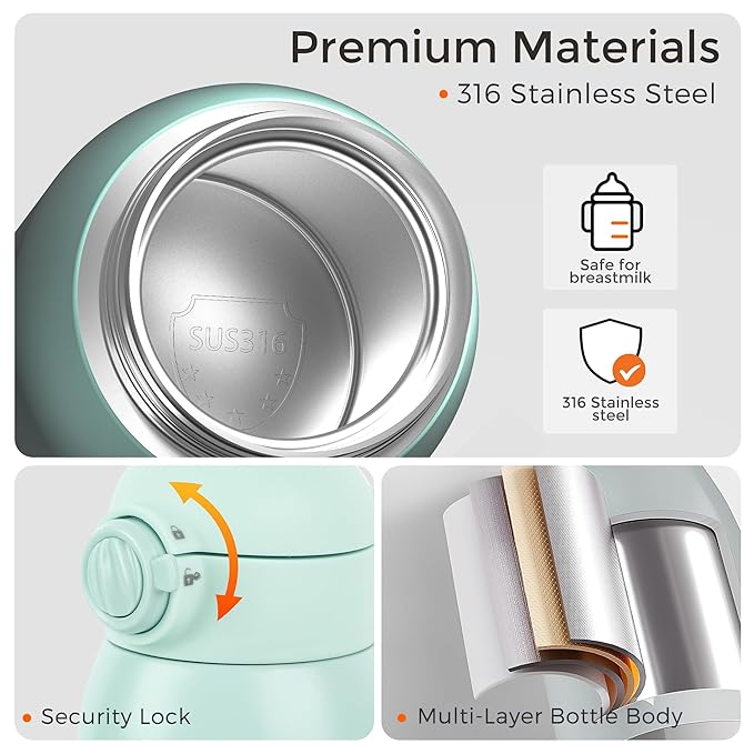 • Safe Materials & Mom-Friendly Design: Crafted from food-grade silicone accessories and 316 stainless steel. The secure safety lock and leak-proof plug prevent spills, ensuring peace of mind during travel. Portable baby bottle warmer includes a sponge brush to make cleaning effortless, helping you keep the bottle clean with ease