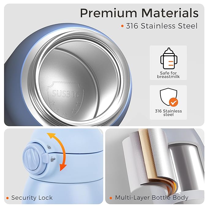 • Safe Materials & Mom-Friendly Design: Crafted from food-grade silicone accessories and 316 stainless steel. The secure safety lock and leak-proof plug prevent spills, ensuring peace of mind during travel. The inner wall of the bottle features clear measurement markings, making it easy to pour and track the amount of milk added. This portable baby bottle warmer includes a sponge brush to make cleaning effortless, helping you keep the bottle clean with ease