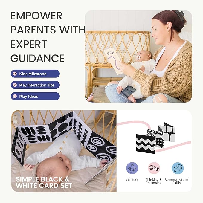 • Stimulate Visual & Auditory Senses: Newborns are highly sensitive to light and sound. The rolling bell and black & white cards engage your baby's attention, effectively stimulating visual and auditory development while encouraging focus and tracking skills