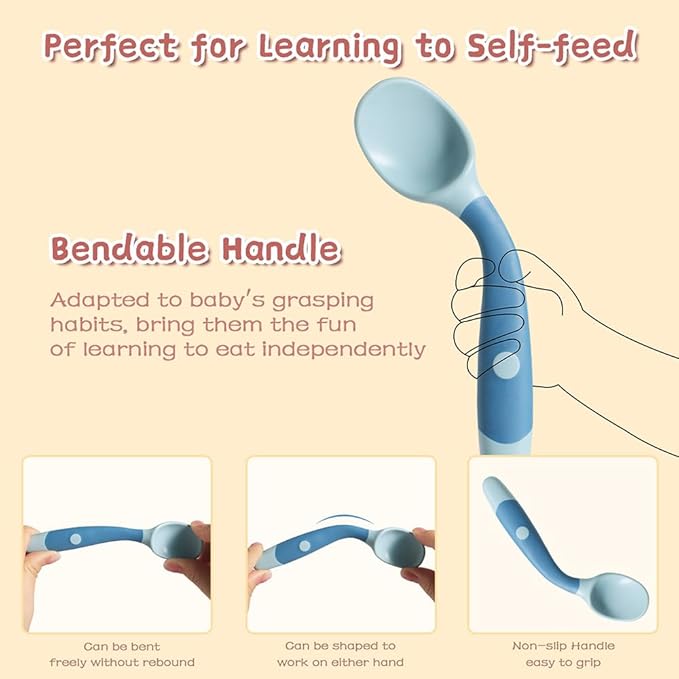 • Bendable Handles: Flexible, adjustable handles help babies scoop and easily reach their mouths, perfect to learn self-feeding.