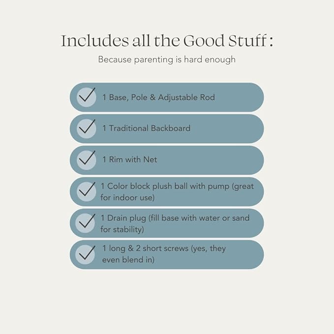 • Easy Assembly: Assembles in minutes! This set includes: 1 base, 1 main pole, 1 adjustable rod, 1 backboard, 1 rim, 1 net, 1 plush ball, 1 ball pump, 1 long screw, 2 short screws, and 1 drain plug.