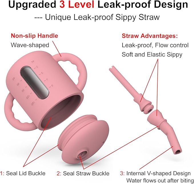 • Leak-proof Straw Cup: 3 levels sealing structure, seal lid buckle + seal straw buckle + internal V-shaped lock, no leakage when inverted/shaken. It is more convenient for babies to drink water independently.
