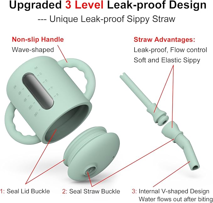 • Leak-proof Straw Cup: 3 levels sealing structure, seal lid buckle + seal straw buckle + internal V-shaped lock, no leakage when inverted/shaken. It is more convenient for babies to drink water independently.