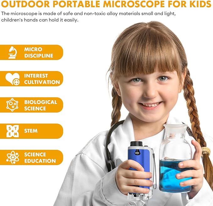 • Compact & Travel-Friendly: Designed with portability in mind, this lightweight and compact microscope is easy for kids to carry and use anywhere—whether at school, on nature walks, or during travel. Ideal for both indoor and outdoor exploration.
