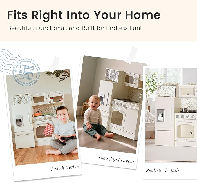 • All-in-One Functional Areas: Includes a stovetop, sink, microwave, oven, pretend ice dispenser, coffee station, and open shelving. Encourages imaginative play while helping kids understand everyday kitchen routines.
