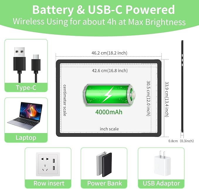 • [Long-Lasting 4000mAh Battery & Fast USB-C Charging]: Portable A3 light table with 4+ hours runtime at max brightness (8+ hours at medium). Recharge via universal USB-C in 3.5 hours – compatible with laptops, power banks, and car chargers. No more cable clutter! Stable USB-C port outperforms fragile micro-USB, ideal for on-the-go crafting