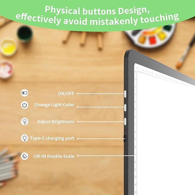 • [Dual Measurement System & Spacious A3 Workspace]: CM/INCH dual scales adapt to global crafting standards.The size of tracing light box is 18.2 x 13.4 in (46.2 x 33.9 cm). Generous 16.8 x 12 in (42.6 x 30.5 cm) illuminated area fits A3 paper, diamond painting kits, and tattoo stencils. Ultra-slim 0.3 in (0.8 cm) profile slips into portfolios. Note: Surface is scratch-resistant but avoid sharp tools
