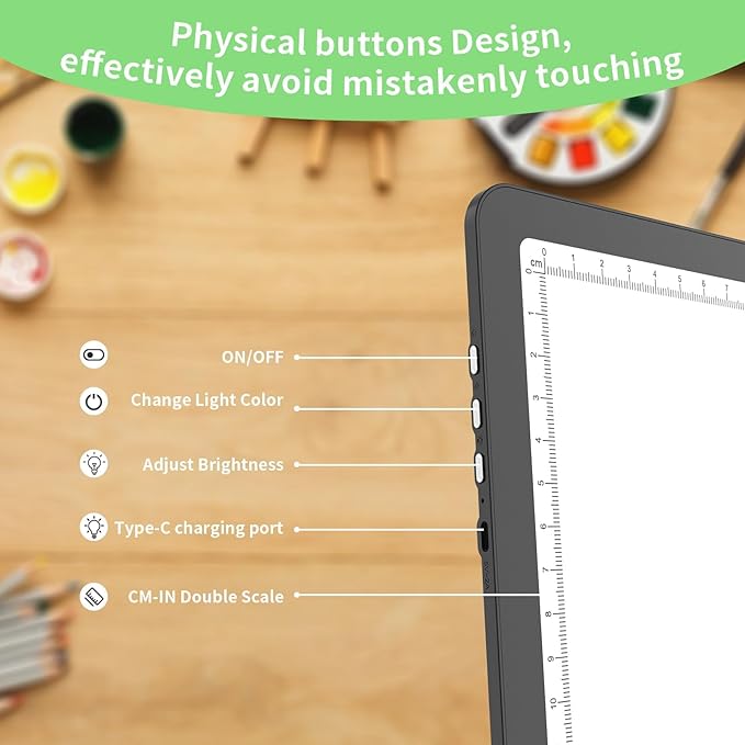 • [Dual Measurement System & Spacious A4 Workspace]: CM/INCH dual scales adapt to global crafting standards. The size of tracing light box is 13.9 x 10.0 in (35.2 x25.4 cm). Generous 12.5 x 8.6 in (31.6x21.8cm) illuminated area fits A4 paper, diamond painting kits, and tattoo stencils. Ultra-slim 0.35 in (0.9 cm) profile slips into portfolios. Note: Surface is scratch-resistant but avoid sharp tools