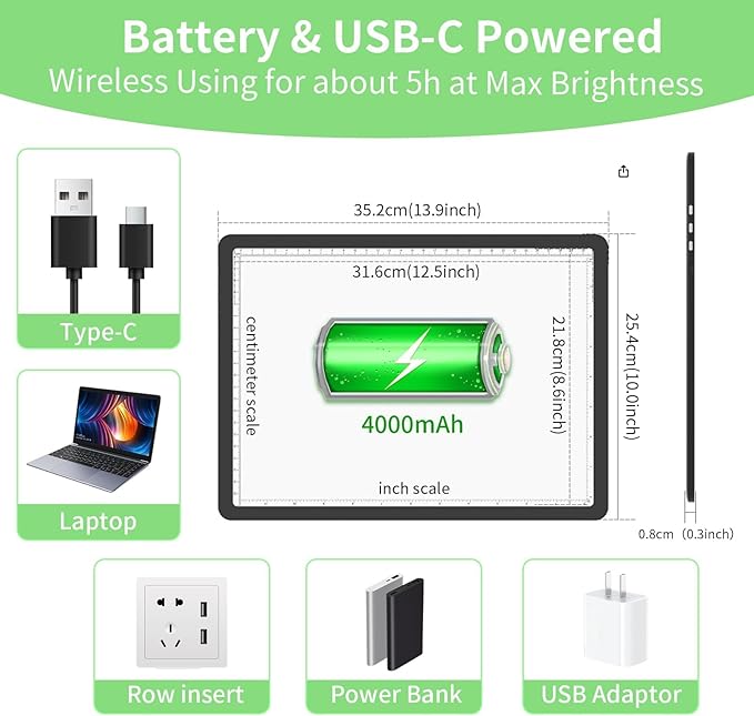 • [Long-Lasting 4000mAh Battery & Fast USB-C Charging]: Portable A4 light table with 4+ hours runtime at max brightness (8+ hours at medium). Recharge via universal USB-C in 3.5 hours – compatible with laptops, power banks, and car chargers. No more cable clutter! Stable USB-C port outperforms fragile micro-USB, ideal for on-the-go crafting