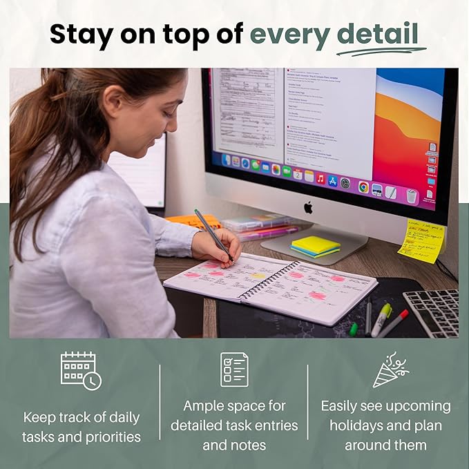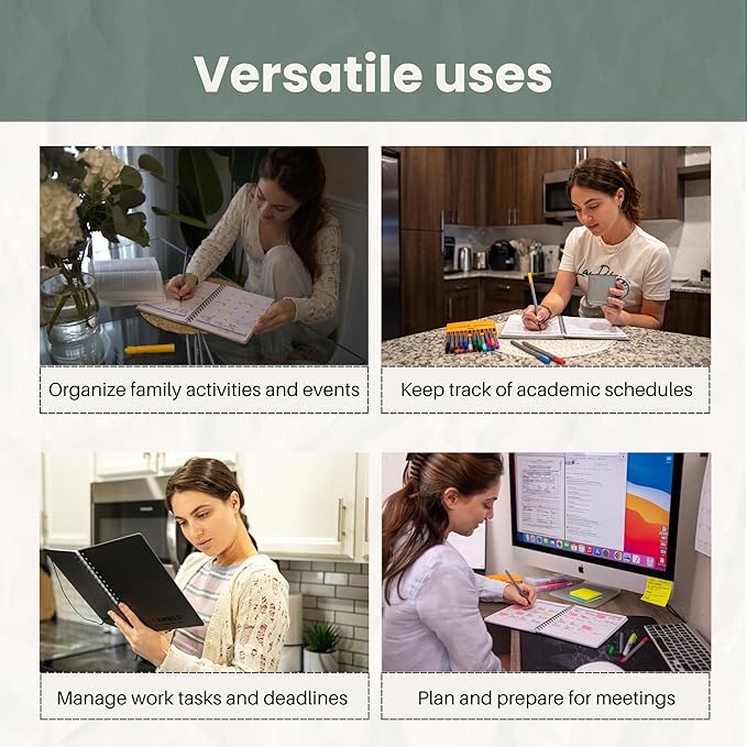 • Thoughtful Features - Designed by avid planners for office workers, students and active moms alike, our calendar + planner has ample room to jot down all of your appointments, birthdays, events, meetings and more. Also equipped with a back pocket to hold notes, shopping lists, pens and more.