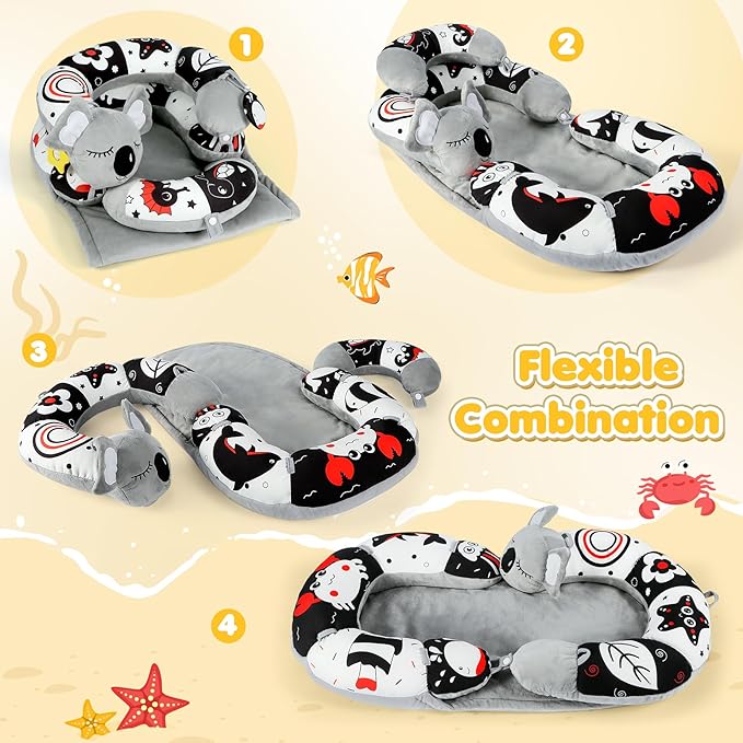 • ใ€๐ˆ๐ง๐ ๐ž๐ง๐ข๐จ๐ฎ๐ฌ ๐ƒ๐ž๐ญ๐š๐œ๐ก๐š๐›๐ฅ๐ž ๐ƒ๐ž๐ฌ๐ข๐ ๐งใ€‘Our tummy time mat features detachable C-shaped support pillow and dangling toys to stimulate senses development. Including black and white & colorful stackable pillows with animal pattern, anti-slip tummy time mat, BPA-free teether which is safe for baby to chew, and crinkle paper can make the sound to attract baby, boost babies' hearing skill. Promotes early body development and interactive play.