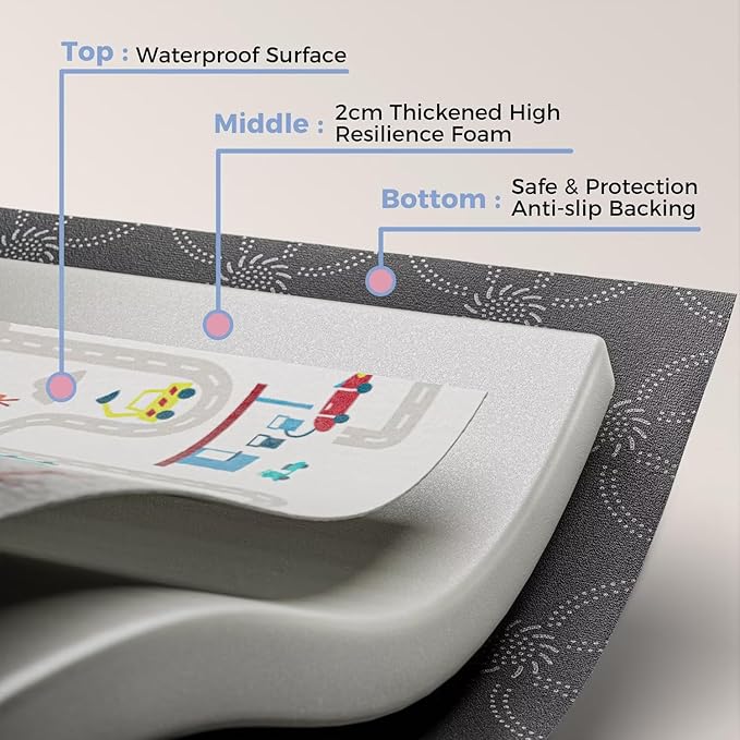 • 【Easy to Clean】Without worries stains and spills! the surface of baby playmat is wateproof and the liquid will not soak the mat, easy to clean with tissue or wet towel. Design with special quilting process that support washed in a washing machine without deformation.
