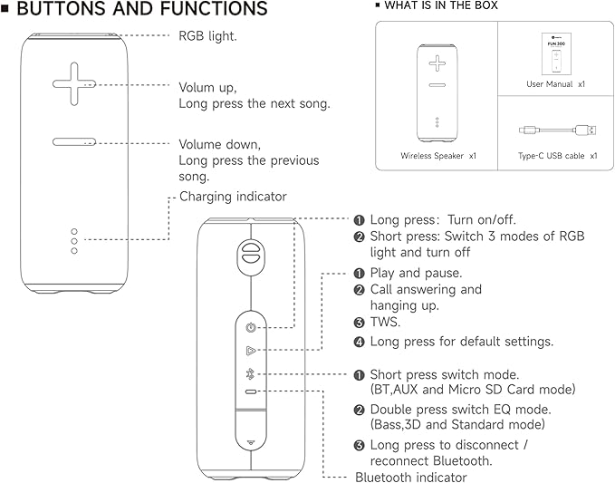 • 3 EQ Modes + UP to 8H Playtime for Nonstop Entertainment : Switch between Standard, 3D Surround, and Bass Boost modes to optimize sound for open-road motorcycle rides, poolside floating, or home parties. The up to 8+ hour battery keeps the music going all day, whether you're camping, biking, or relaxing by the water